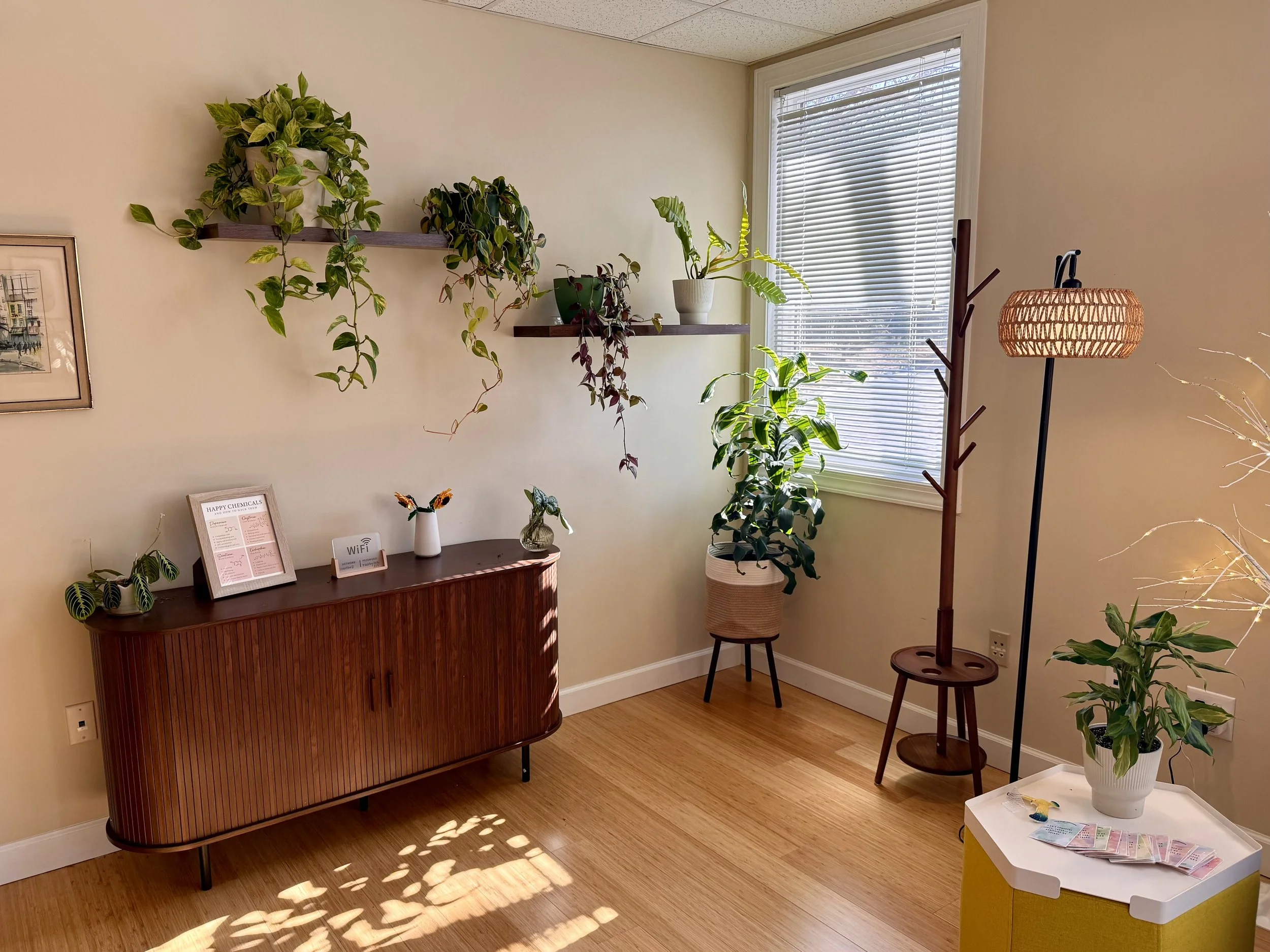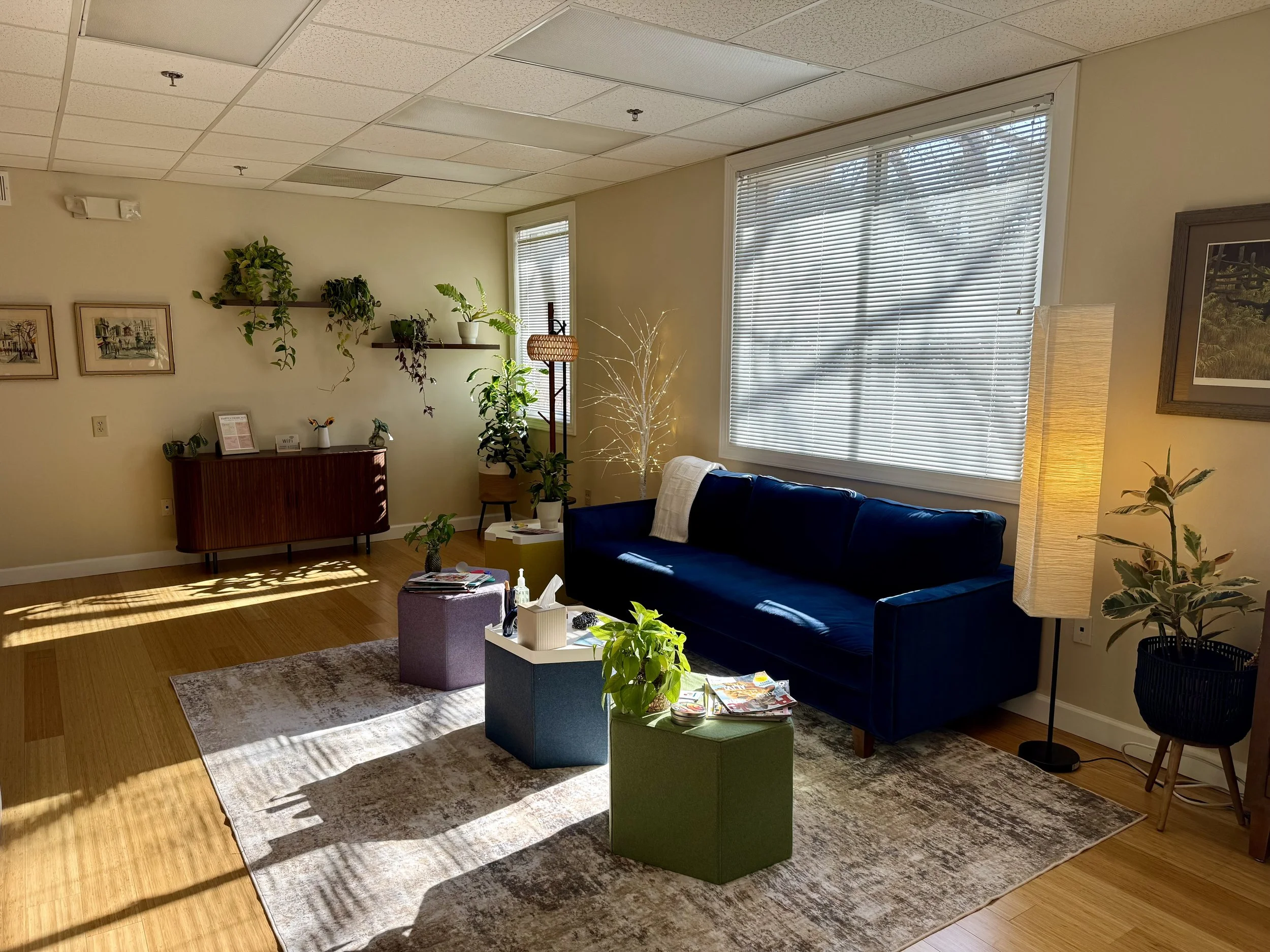 We offer a calm, welcoming space designed to help you feel at ease the moment you arrive. Our in person office is intentionally warm and grounding, with comfort and privacy in mind, so you can settle in and focus on yourself or your child.